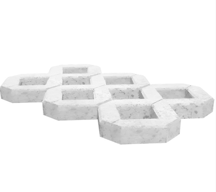 Газонная решетка изготавливается из тяжелого бетона, что придает ей устойчивость к механическим нагрузкам. Благодаря толщине 100 мм она выдерживает вес легковых и грузовых автомобилей, что делает ее идеальным решением для парковок.